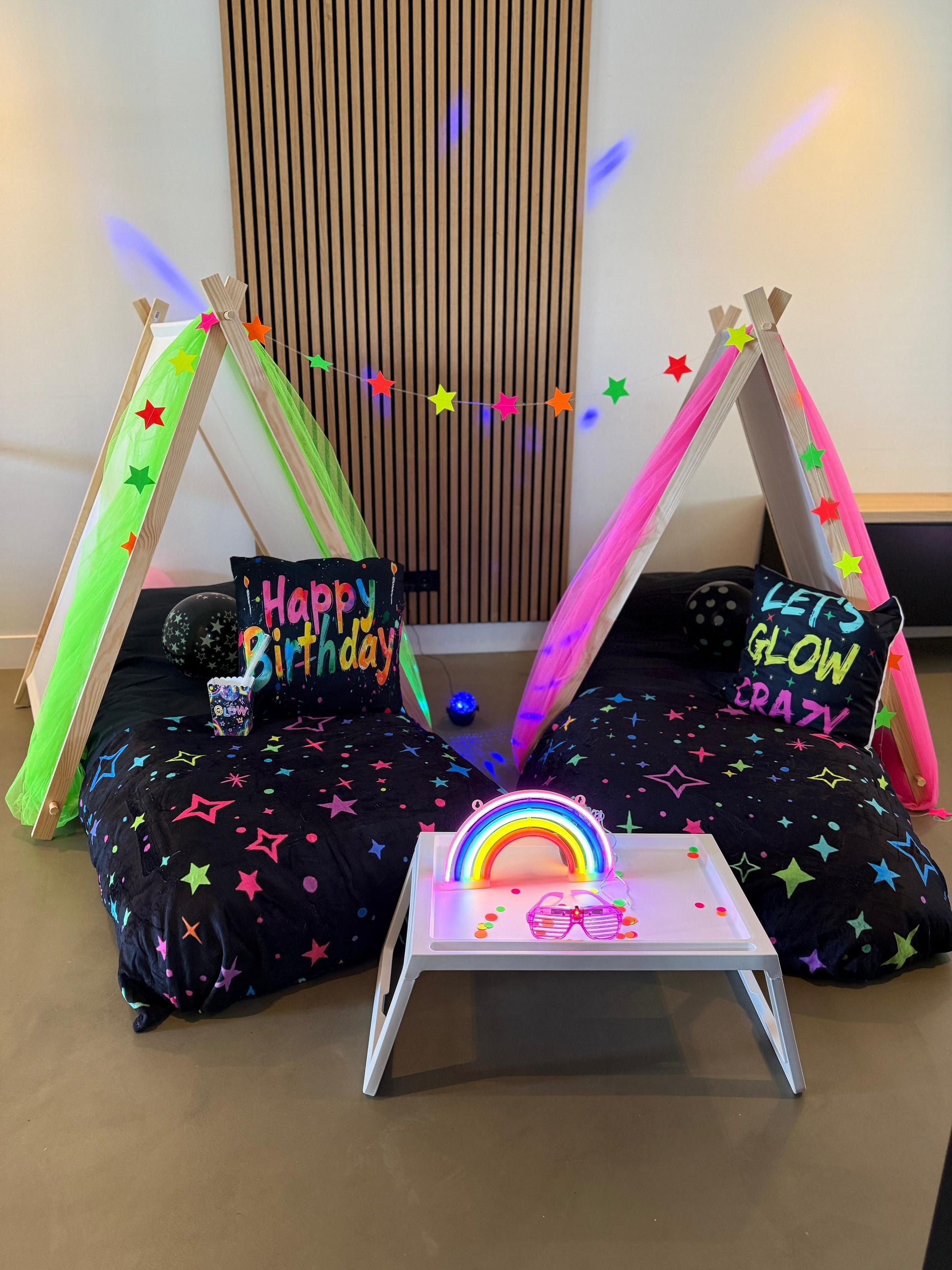 De tipi tentjes worden gestyled in neon tinten met zachte kussens, dekentjes en glow accessoires. Zodra de lampen uitgaan, komt het feestje écht tot leven: denk aan lichtgevende armbanden, glow sticks en decoratie die schittert in het donker. Perfect voor een verjaardag, meidenavond of een logeerpartijtje vol energie en fun.