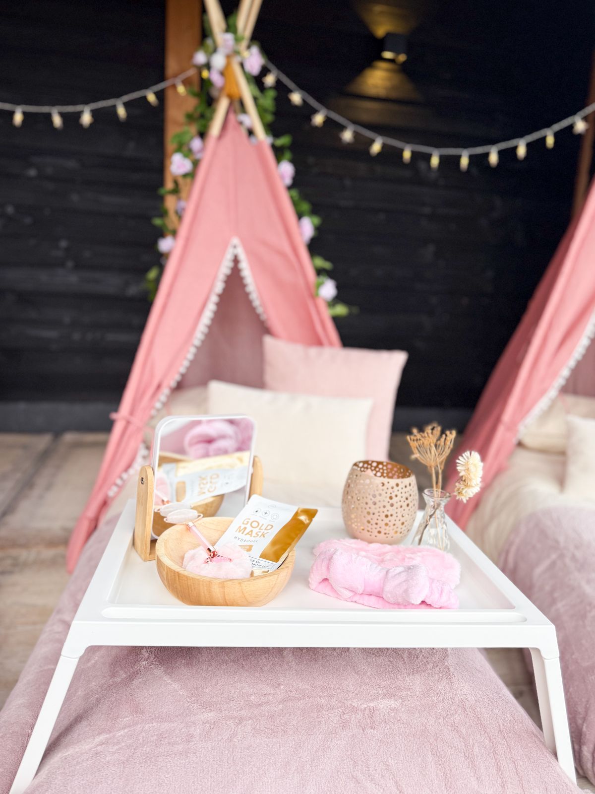 De avond staat in het teken van lekker relaxen, kletsen en lachen terwijl jullie genieten van een echt verwenmoment. Onze tipi tentjes worden sfeervol ingericht zodat je het ultieme spa-gevoel ervaart. Van zachte kussens en dekentjes tot lichtslingers en decoratie die de kamer omtoveren tot een luxe wellness-omgeving.
