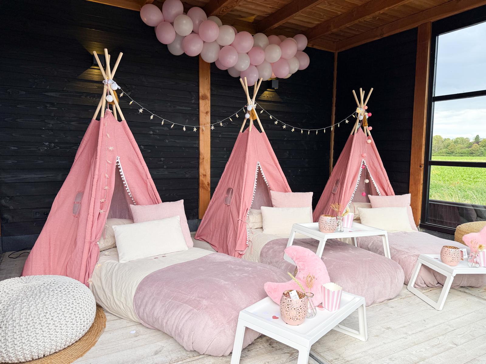 De sfeervolle tipi tentjes worden prachtig aangekleed in zachte roze tinten, met fluffy kussens, plaids en lichtslingers die zorgen voor een gezellige en knusse sfeer. Elke gast krijgt zijn eigen tentje met matras, kussen en dekentje, zodat iedereen zich helemaal kan nestelen. Perfect voor een tipi tent feestje, verjaardag of meidenavond vol plezier.